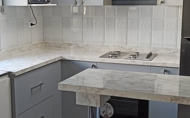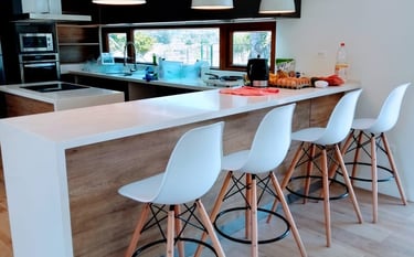 Con un toque personalizado, la cubierta de fabricación propia en MDF de 18 mm regruesado en bordes, revestida con fórmica Lamitech color código 3111 de la línea granito y mármoles, añade un encanto singular. El mesón, con una elegante pata de aluminio de 85 cm de altura, se une a la armonía cromática con su cubierta del mismo tono 3111.
