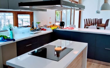 Encantadora en cada detalle, nuestra cocina esquinera es una verdadera obra maestra de diseño personalizado. Cuidadosamente concebida por nuestro talentoso equipo, esta cocina ha sido pensada hasta en los mínimos detalles, considerando los puntos de gas y la disposición precisa de cada artefacto.