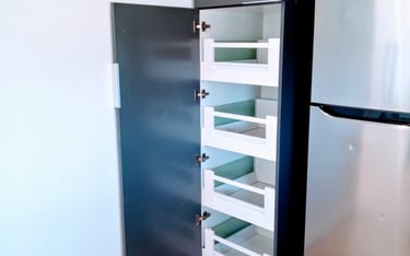 Cada detalle ha sido cuidadosamente pensado, desde los cajones con riel telescópico oculto de 500 mm de cierre suave, que ofrecen una apertura y cierre sin esfuerzo, hasta las puertas de apertura superior con bombas neumáticas que añaden un toque de innovación y practicidad.