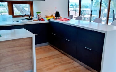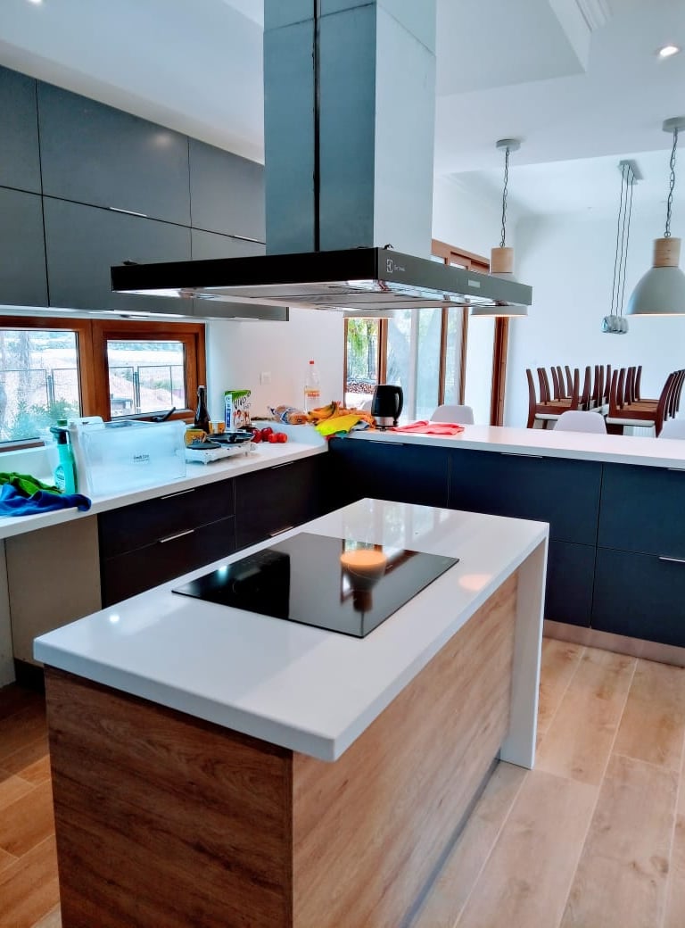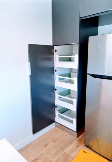 La calidad se manifiesta en cada detalle, desde las bisagras de cierre suave hasta el bombín neumático, que asegura un movimiento fluido en las puertas de apertura superior. El lavaplato, ya instalado, ha sido cuidadosamente integrado, adaptando las puertas para sincronizarlas con la nueva paleta de colores.